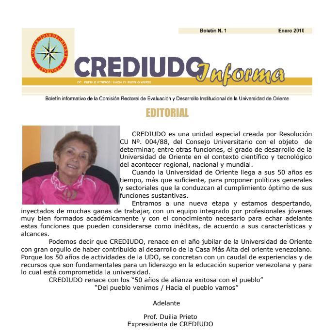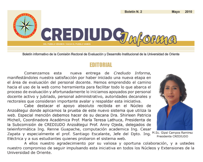 Comenzamos esta nueva entrega de Crediudo Informa, manifestándoles nuestra satisfacción por haber iniciado una nueva etapa en el área de evaluación del personal docente. Hemos emprendido el camino hacia el uso de la web como herramienta para facilitar todo lo que abarca el proceso de evaluación y afortunadamente lo iniciamos apoyados por personal docente activo y jubilado, personal administrativo, autoridades decanales y rectorales que consideran importante avalar y respaldar esta iniciativa. Cabe destacar el apoyo absoluto recibida en el Núcleo de Anzoátegui donde aplicamos la prueba de este nuevo sistema que utiliza la web. Especial mención debemos hacer de su decana Dra. Shirleen Patricia Michell, Coordinadora Académica Prof. María Teresa Lathuca, Presidenta de la Subcomisión de CREDIUDO Anzoátegui Prof. Anny Ojeda, delegados de teleinformática Ing. Renne Guapache, computación academica Ing. Cesar Zapata y especialmente el prof. Santiago Escalante, Jefe del Dpto. Ing. Eléctrica y a sus estudiantes quienes probaron el sistema web. A ellos nuestro agradecimiento por su valiosa y oportuna colaboración, y a ustedes nuestro compromiso de seguir impulsando esta iniciativa en todos los Núcleos y Extensiones de la Universidad de Oriente.